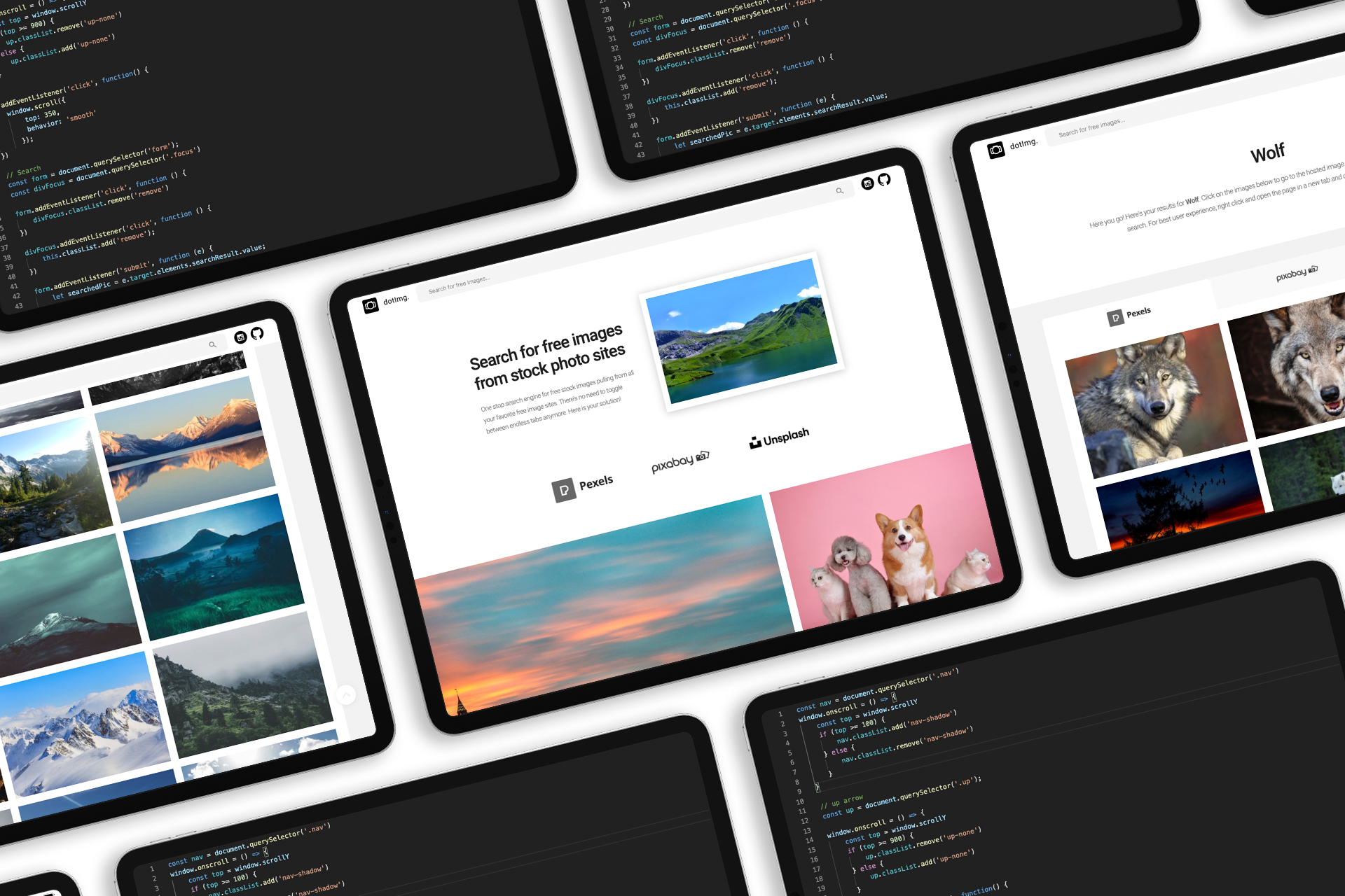 Although there are many free stock photo sites, 3 of them are the most reliable for high quality and robust amount of content. I used Pexels, Pixabay, and Unsplash APIs and connected them to populate the user's search.